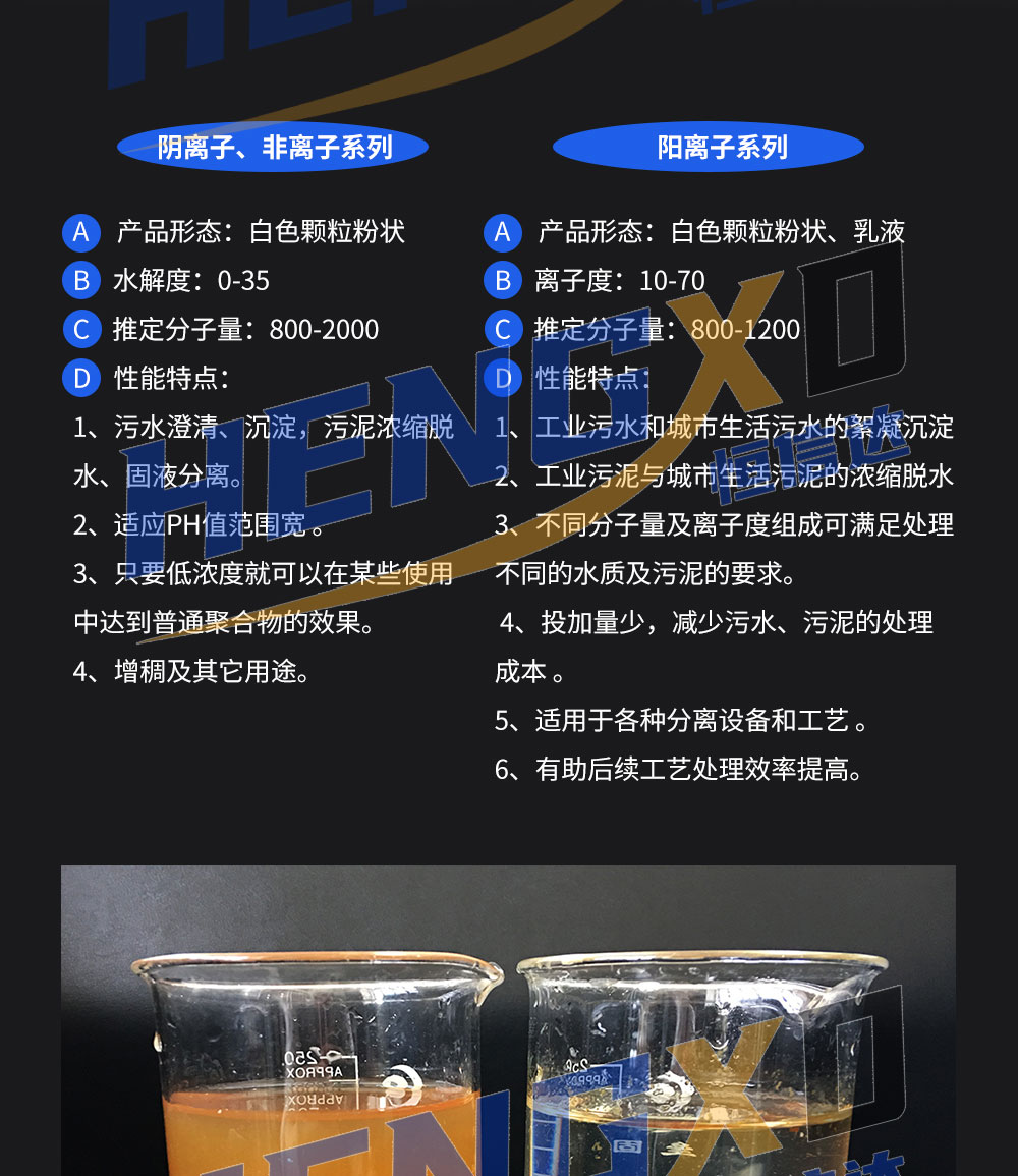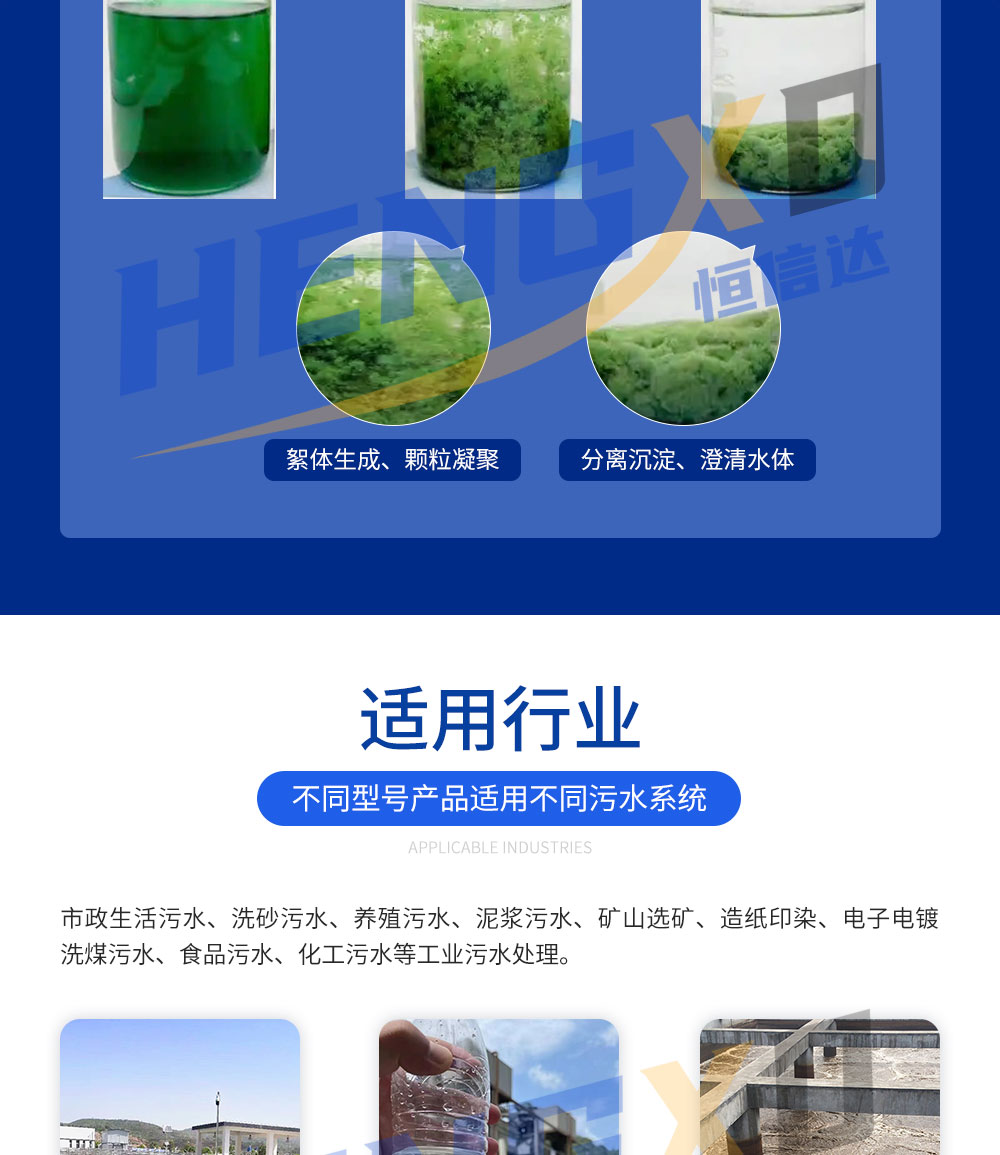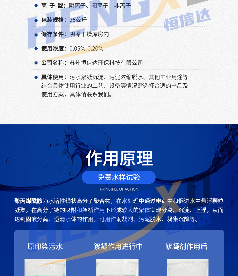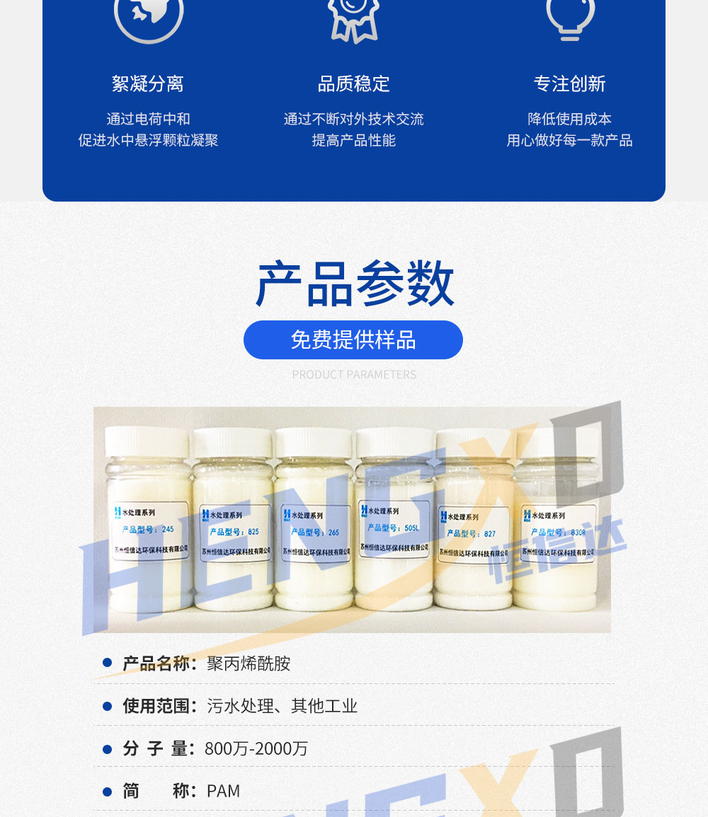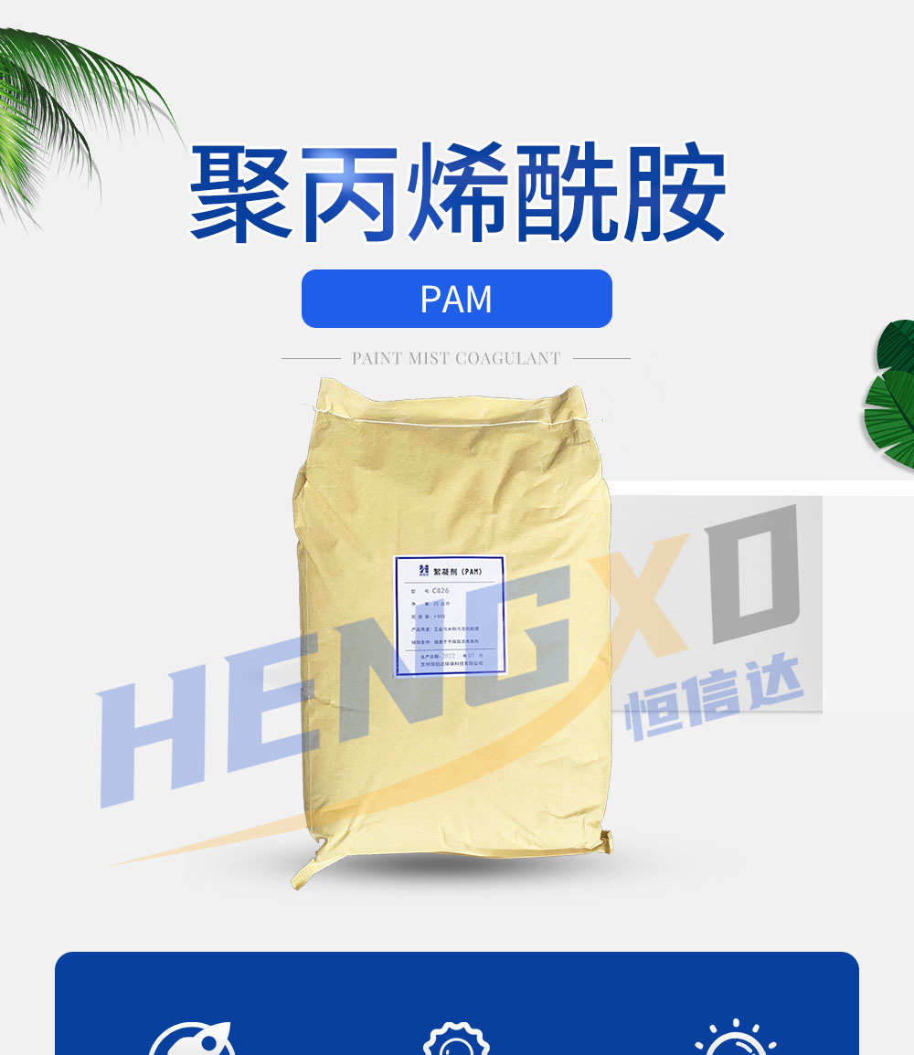 聚丙烯酰胺PAM为水溶性线状高分子聚合物,可用作助凝剂、污泥脱水、凝集沉降以及造纸助剂、增稠润滑等。在水处理中通过电荷中和促进水中悬浮颗粒凝聚,在高分子链的吸附和架桥作用下形成较大的絮体实现分离、沉淀、上浮,从而达到固液分离、澄清水体的作用。