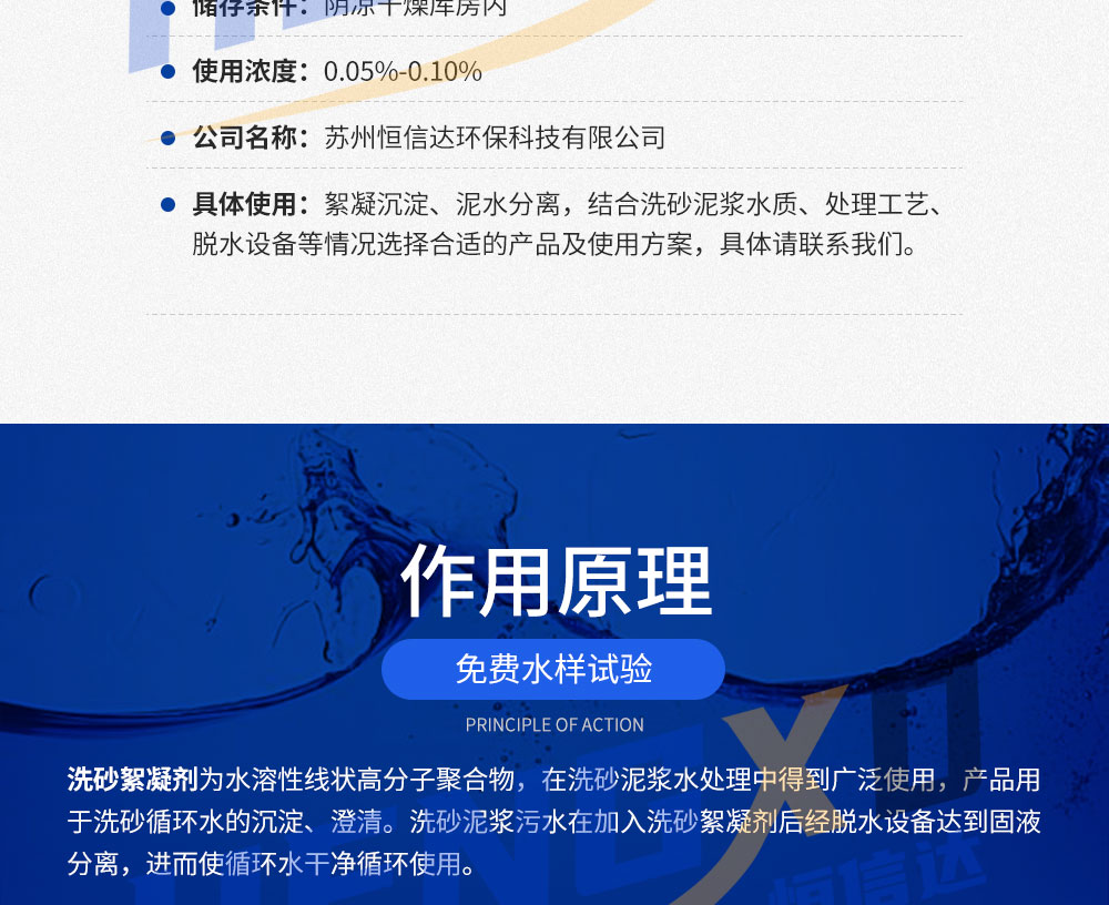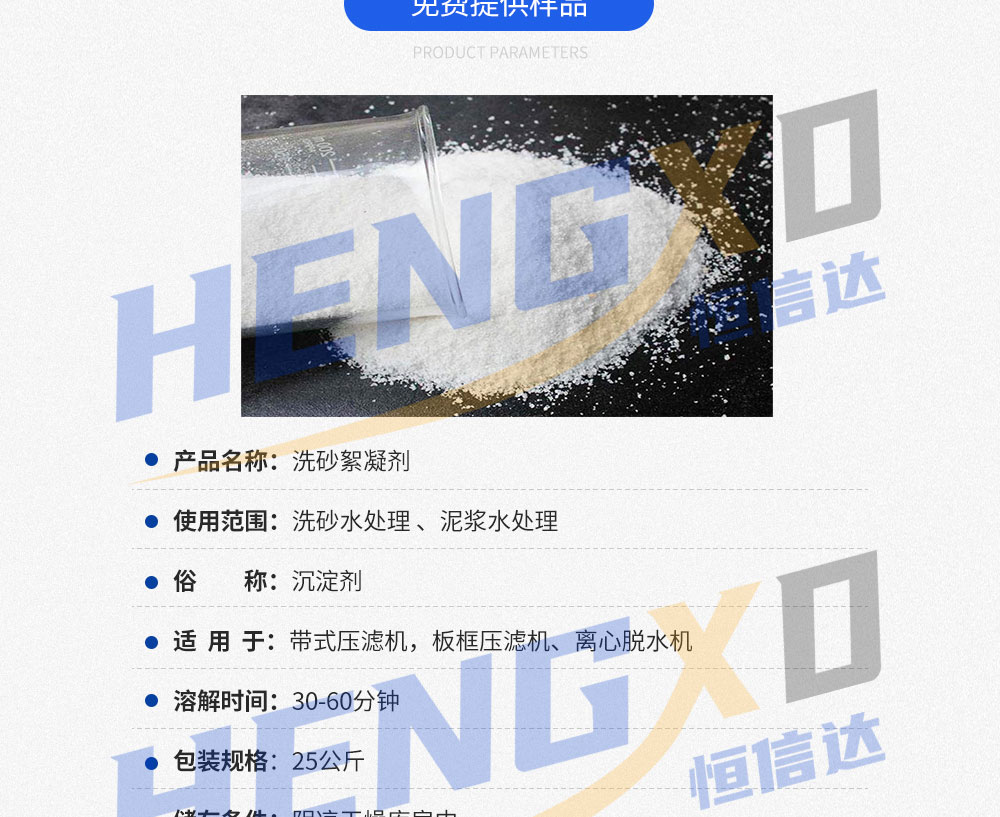 产品名称:洗砂絮凝剂,使用范围:洗砂水处理 、泥浆水处理,俗称:沉淀剂,适用于:带式压滤机,板框压滤机、离心脱水机,溶解时间:30-60分钟,包装规格:25公斤,储存条件:阴凉干燥库房内,使用浓度:0.05%-0.10%,具体使用:絮凝沉淀、泥水分离,结合洗砂泥浆水质、处理工艺、脱水设备等情况选择合适的产品及使用方案,具体请联系我们。