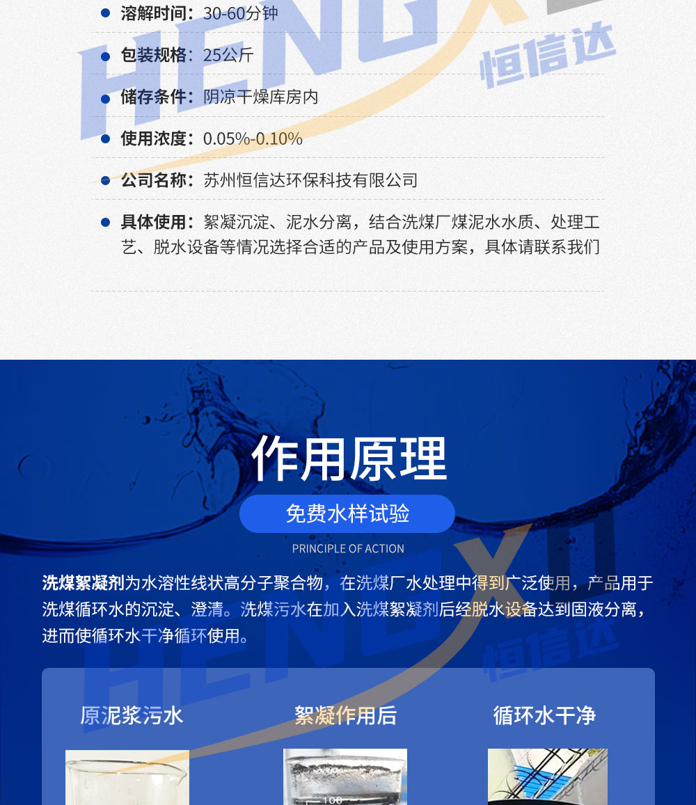产品名称:洗煤絮凝剂,使用范围:洗煤污水处理,溶解时间:30-60分钟,包装规格:25公斤,储存条件:阴凉干燥库房内,使用浓度:0.05%-0.10%,具体使用:絮凝沉淀、泥水分离,结合洗煤厂煤泥水水质、处理工艺、脱水设备等情况选择合适的产品及使用方案,具体请联系我们。