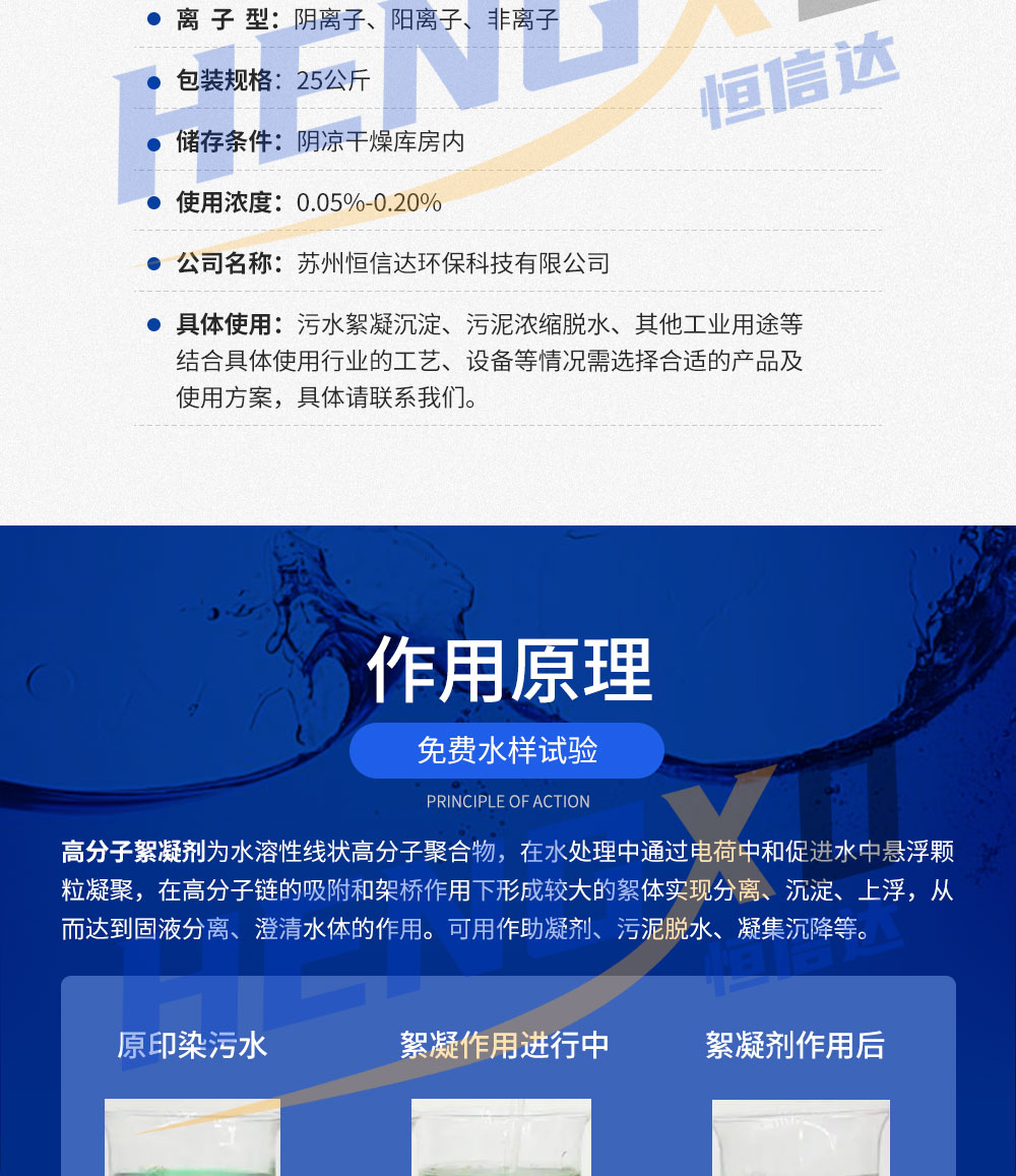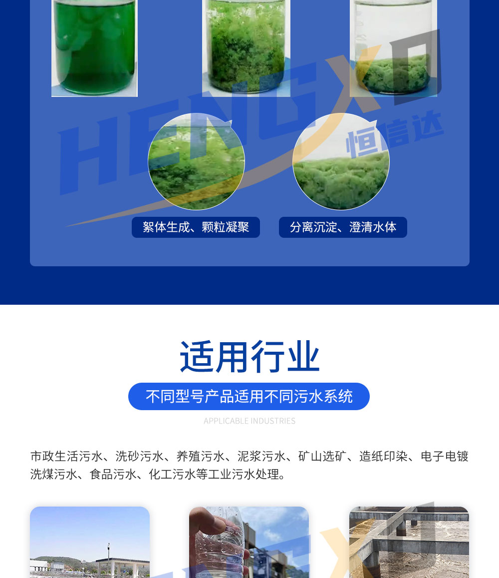 工业污水絮凝剂用于市政生活污水、洗砂污水、养殖污水、泥浆污水、矿山选矿、造纸印染、电子电镀洗煤污水、食品污水、化工污水等工业污水处理。工业污水絮凝剂性能特点:1、污水澄清、沉淀,污泥浓缩脱,水、固液分离。2、适应PH值范围宽 。3、只要低浓度就可以在某些使用,中达到普通聚合物的效果。