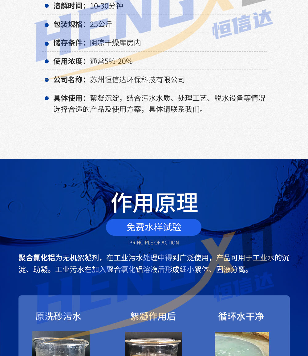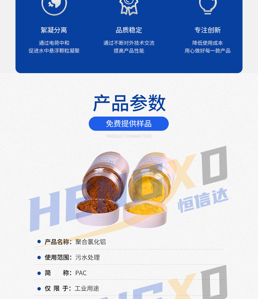 产品名称:聚合氯化铝,使用范围:污水处理,简称:PAC,仅限于:工业用途,溶解时间:10-30分钟,包装规格:25公斤,储存条件:阴凉干燥库房内,使用浓度:通常5%-20%,具体使用:絮凝沉淀,结合污水水质、处理工艺、脱水设备等情况选择合适的产品及使用方案,具体请联系我们。