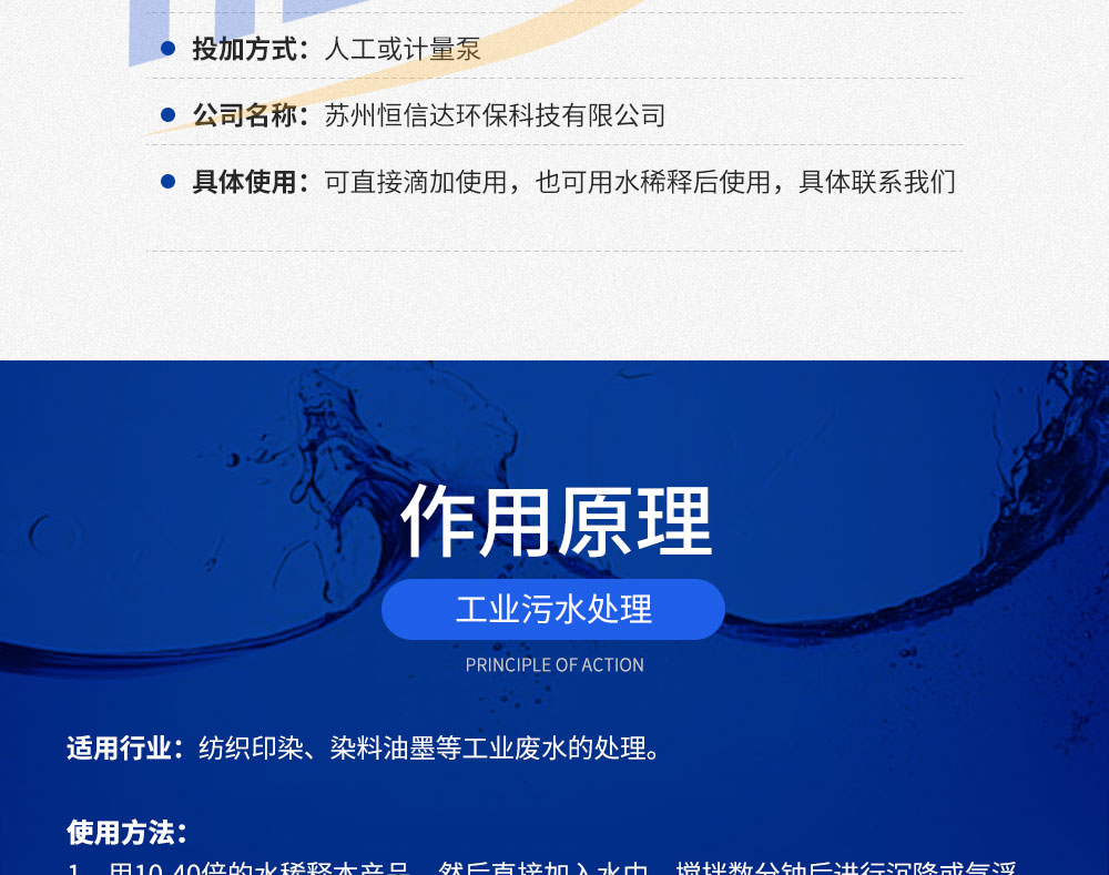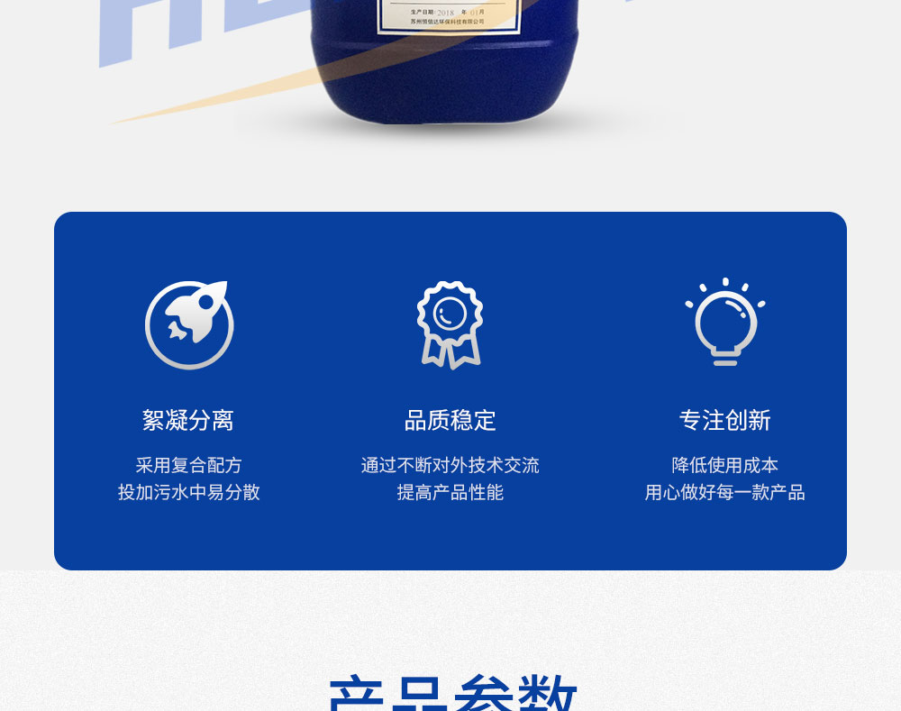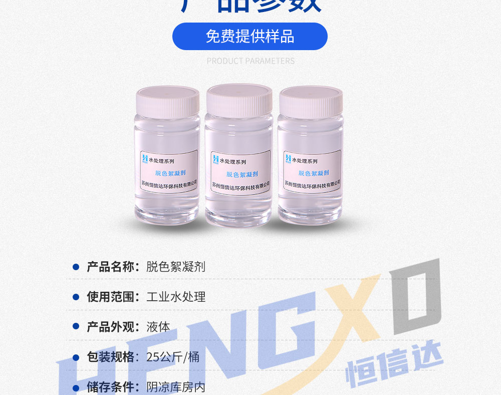 产品名称:脱色絮凝剂,使用范围:工业水处理 ,产品外观:液体,包装规格:25公斤/桶,储存条件:阴凉库房内,投加方式:人工或计量泵,具体使用:可直接滴加使用,也可用水稀释后使用,具体联系我们。