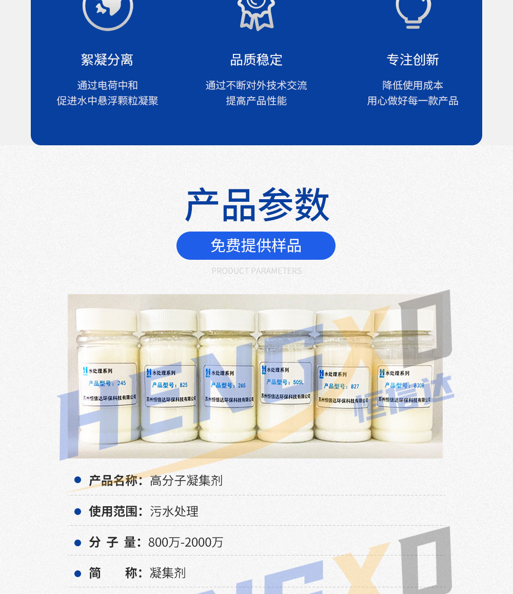 高分子凝集剂(High Molecular Flocculants)为水溶性线状聚合物。可用作助凝剂(Coagulabts)、保留助剂(Retention Aids)、污泥脱水剂(Dewatering Agents)以及凝集沉降剂(Flocculants)等。添加高分子凝集剂于悬浮浊粒子的水中时,借着电性的中和及高分子本身的吸附架桥作用,可促使悬浊粒子快速的凝集沉降,而达到分离,澄清的效果,进而提高处理效率,降低运行成本。