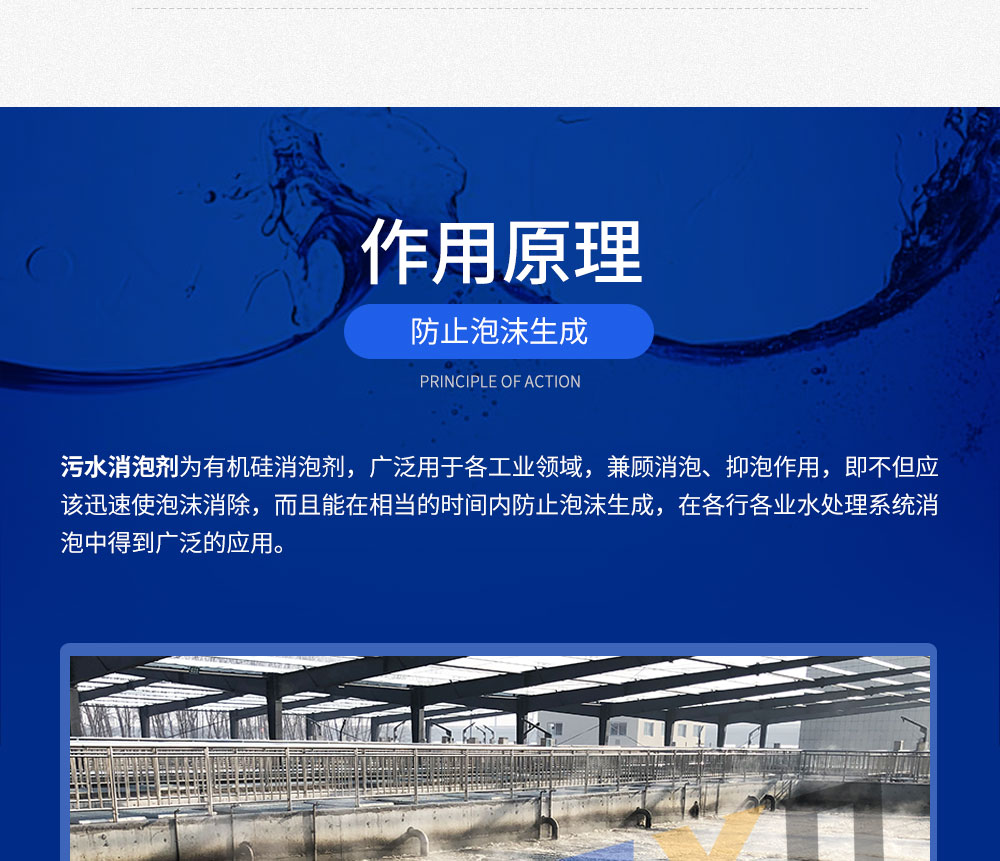 污水消泡剂为有机硅消泡剂,广泛用于各工业领域,兼顾消泡、抑泡作用,即不但应该迅速使泡沫消除,而且能在相当的时间内防止泡沫生成,在各行各业水处理系统消泡中得到广泛的应用。