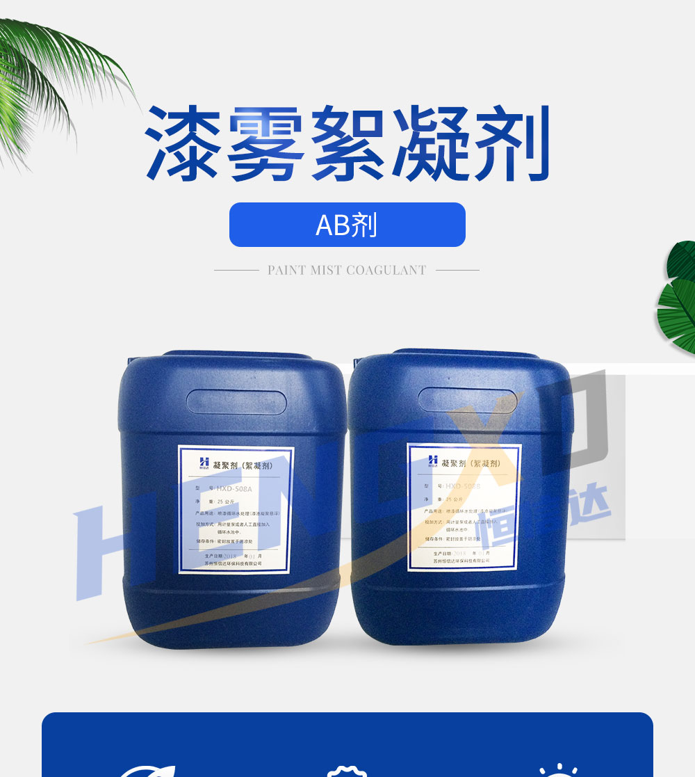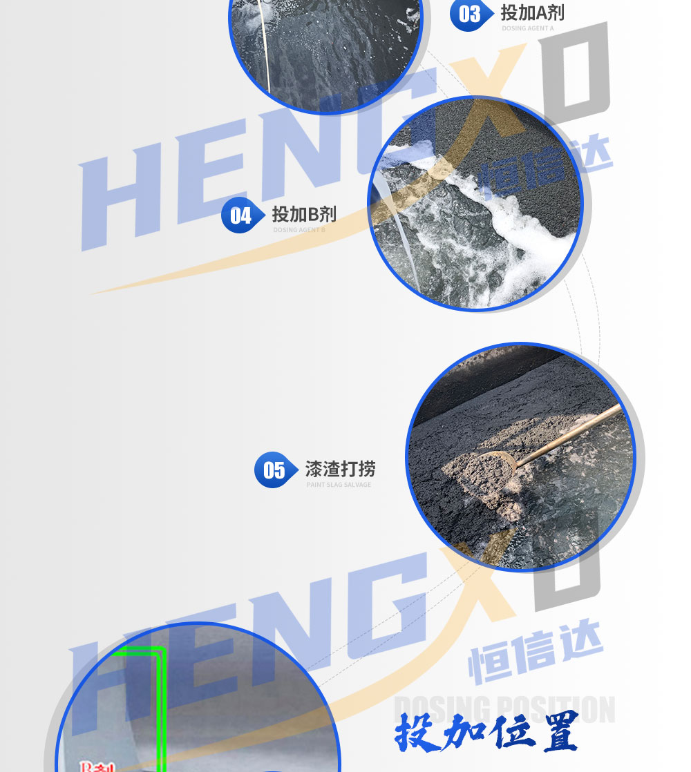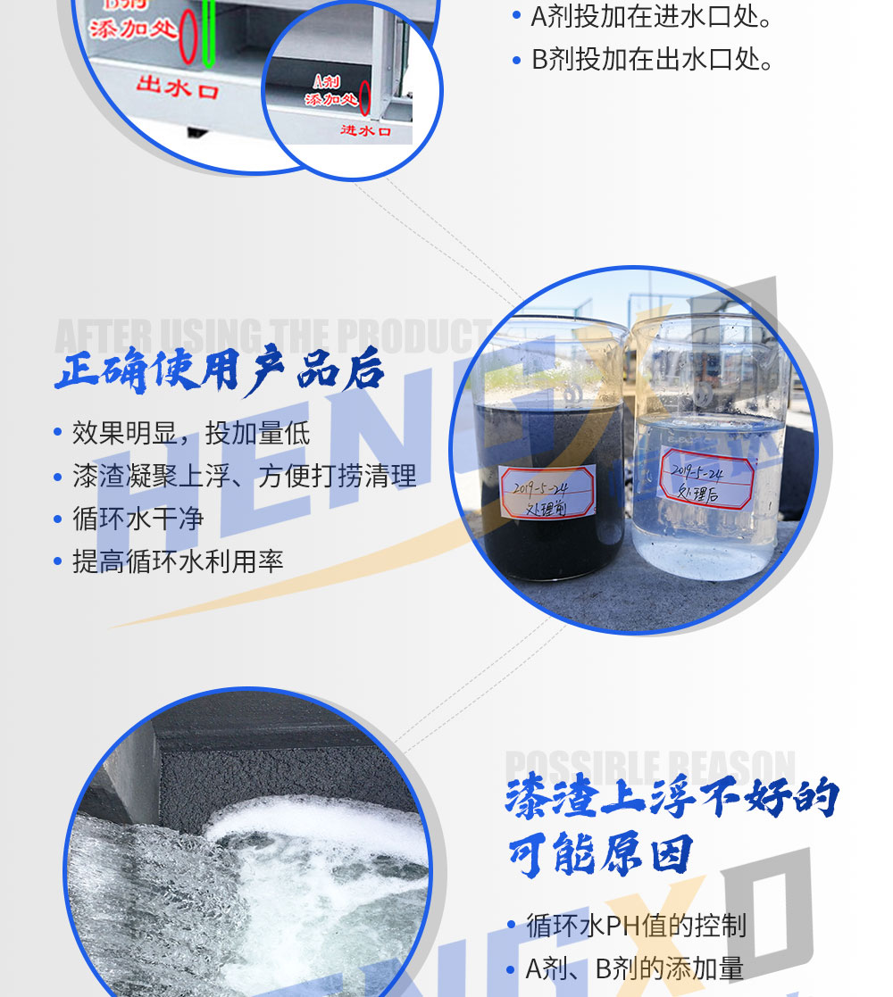 漆雾絮凝剂AB剂主要用在水帘式、水旋喷漆室涂装生产线的循环水处理。漆雾絮凝剂将喷涂循环水中的漆渣经电荷中和、絮凝包裹、凝聚成为多孔的漆渣上浮,便于清理。