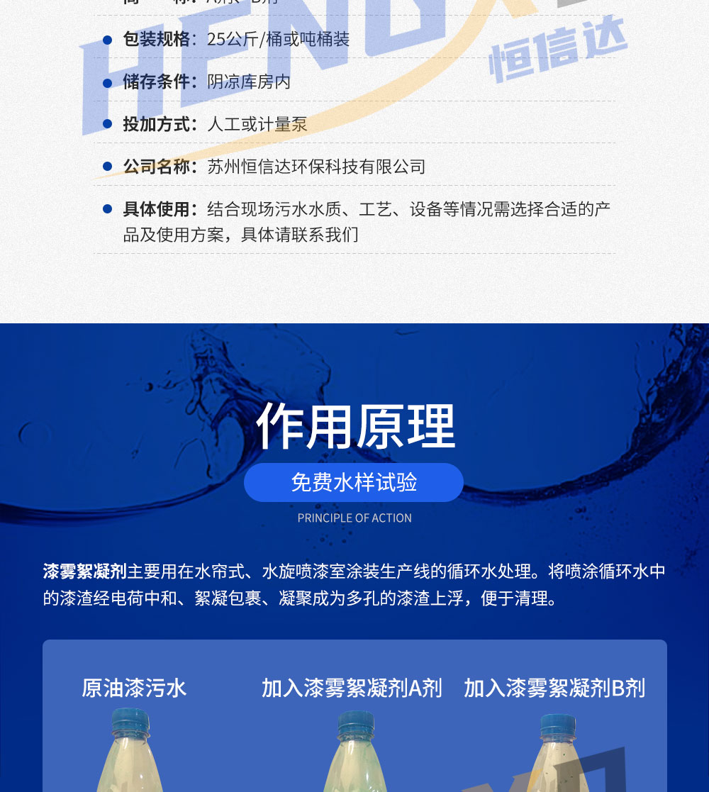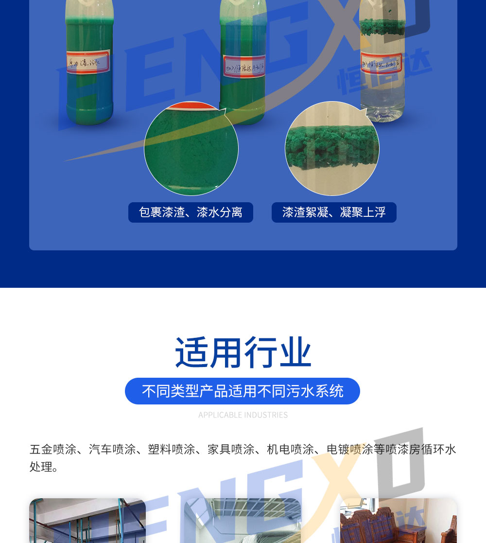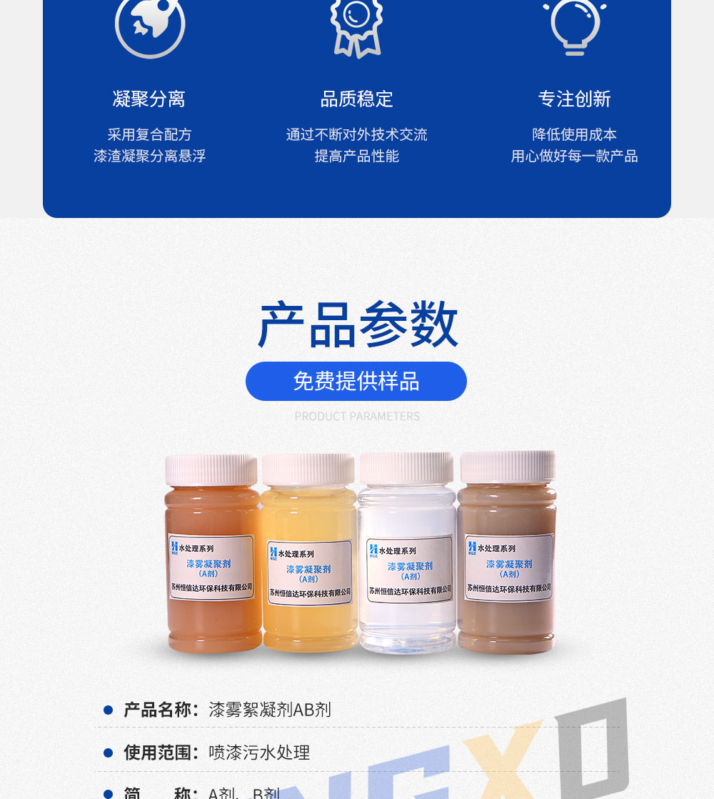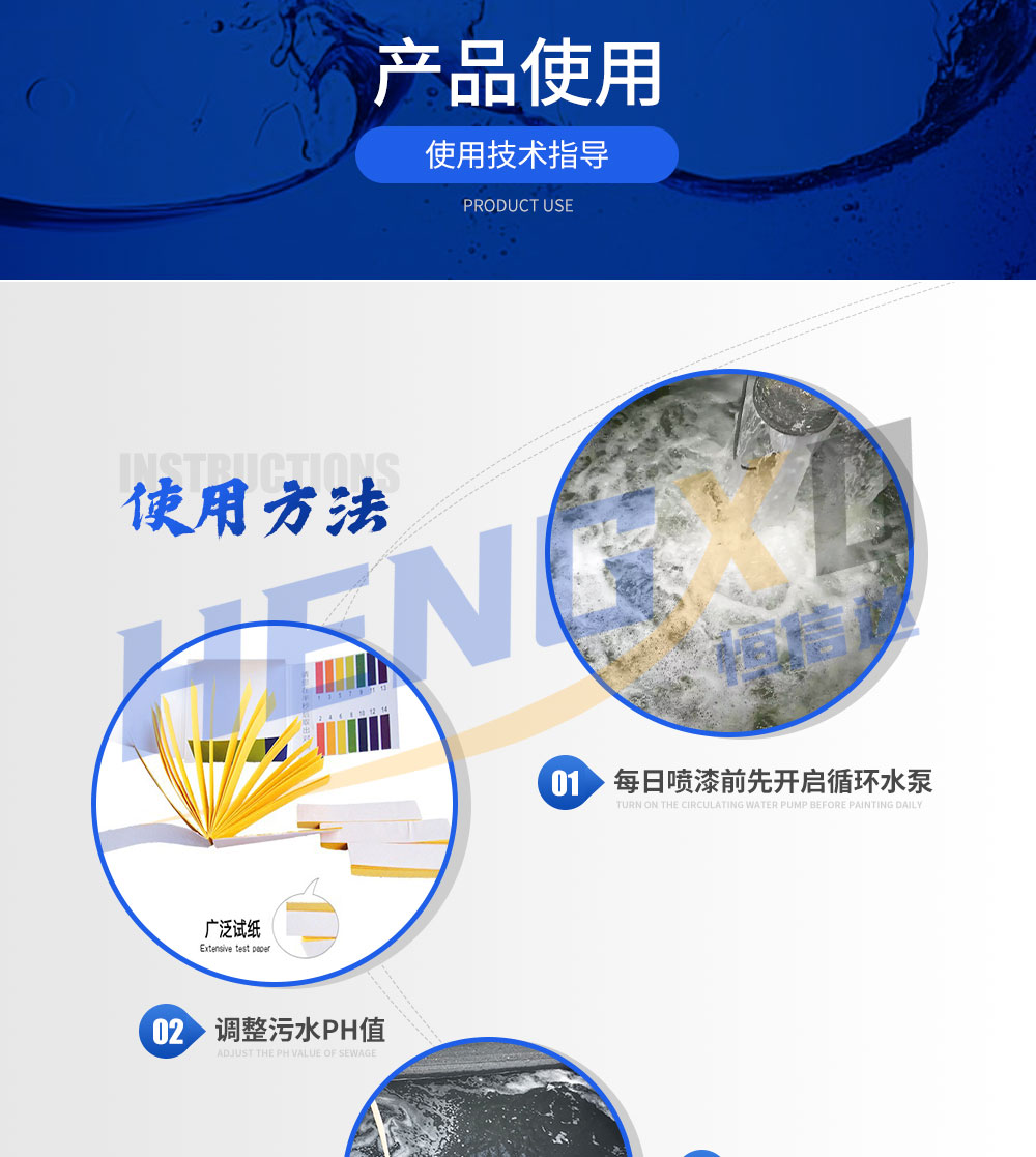 漆雾絮凝剂AB剂主要用在水帘式、水旋喷漆室涂装生产线的循环水处理。漆雾絮凝剂将喷涂循环水中的漆渣经电荷中和、絮凝包裹、凝聚成为多孔的漆渣上浮,便于清理。